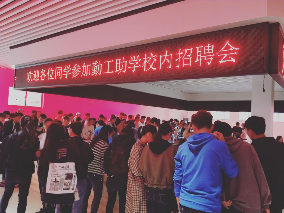 招聘会现场吸引了众多在校学生参加,前来应聘的学生络绎不绝,现场气氛热烈,同学们对照各用工部门的岗位需求,选择符合自己专业、特长及兴趣的岗位报名应聘,用工部门的老师对应聘的学生认真进行了面试,并与面试通过的学生签订勤工助学协议书。整个招聘会现场秩序井然,有条不紊。