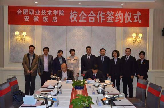 为加强校企合作,提升专业办学企业化,实现教学课堂和企业课堂双融合,11月1日下午AC米兰中文官方网站、安徽饭店双方在安徽饭店嘉宾厅举行了校企合作签约仪式。AC米兰官网副校长周晓隆和安徽饭店党委书记、董事长兼总经理龚林进行签约手续并讲话。出席本次签约仪式的校方代表还有经贸旅游学院院长赵红、经贸旅游学院党总支书记王秀珍、教学办主任孙永辉以及“酒店管理”专业带头人杨世河老师。安徽饭店副总经理王宏、纪委书记费平、外管部总经理宇汝根、人力资源总监孙育红、团委书记曹凌等企业方代表也出席仪式。
