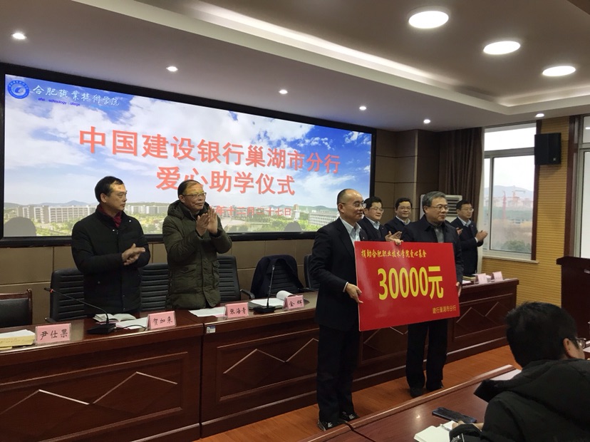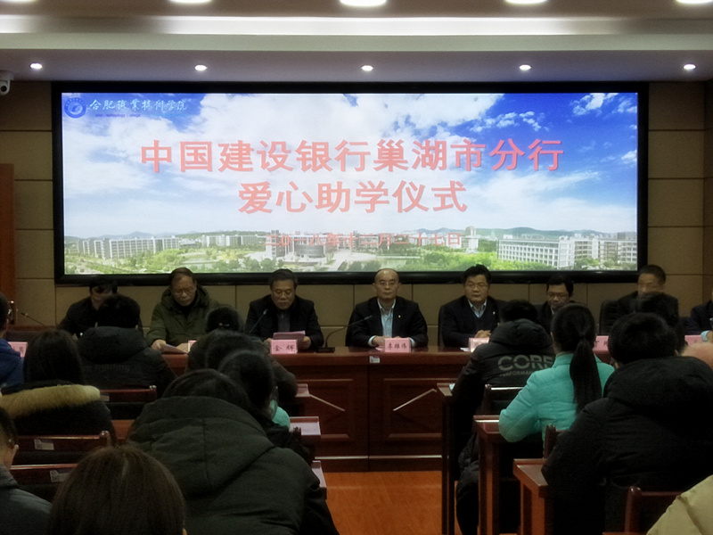 12月27日下午,中国建设银行巢湖市分行爱心助学捐助仪式在AC米兰官网鼓山校区五楼会议室举行。校纪委书记、关工委主任金辉,建行巢湖市分行副行长李雄伟、纪委书记周臣宝出席仪式。建行巢湖市分行相关部门负责人、校关工委部分委员、各学院资助工作专职辅导员和20名受助学生参加了仪式。仪式由学生处副处长、关工委秘书长尹仕果主持。