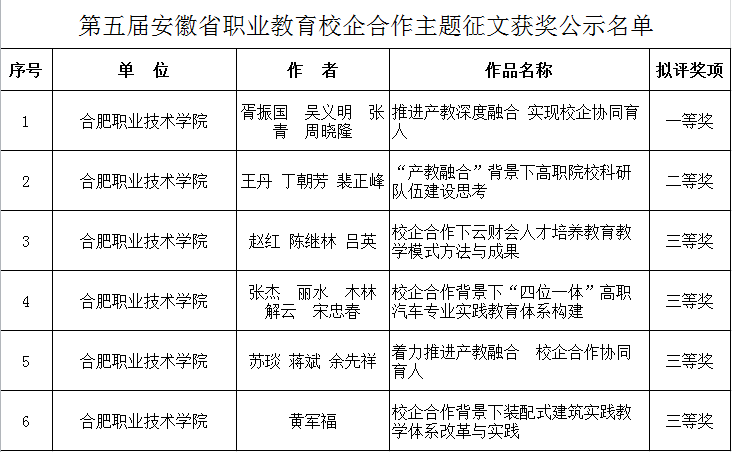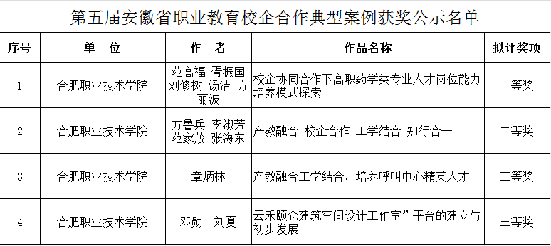 日前,第五届安徽省职业教育校企合作典型案例征集和主题征文评选获奖结果揭晓,AC米兰官网在校企合作典型案例征集中共获得一等奖1项,二等奖1项,三等奖2项;在校企合作主题征文中共获得一等奖1项,二等奖1项,三等奖4项。据悉,此次活动共收到来自全省职业院校报送的典型案例219篇、主题征文239篇。