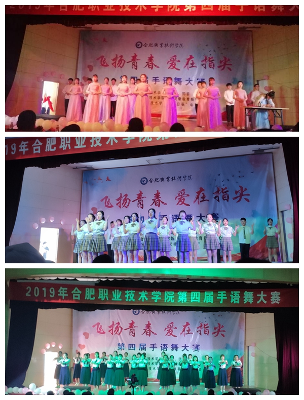 温馨的音乐,灵动的手语,璀璨的舞台,热情的观众,合职学子集聚一堂。来自各二级学院共计八支参赛队伍的表演精彩纷呈,尽显风采。灯光下的舞者用手之舞,表心之语,轻柔的指尖,舞动出爱的奇迹,带给观众视觉的享受与心灵的感动。动感振奋的《我们都是追梦人》,古韵大气的《国家》,阵容庞大,动作整齐划一,点燃了在场每一个人的热情。天使般真情演绎的《和你一样》、轻扬曼舞的《仰望星空》用无声的手语划出了唯美,深深感染了在场的每一位观众。《阳光总在风雨后》不惧风雨,拥抱灿烂;《夜空中最亮的星》青春梦想,坚持追随;《我们都一样》分享力量,努力前行。同学们带着年轻的底气与冲劲,向每一颗年轻的心展示着热爱的力量……别出心裁的队形转换,细腻流畅的动作展示,舞蹈与手语巧妙结合,勾勒出一幅幅动人的画面,手语之美,尽显其中。