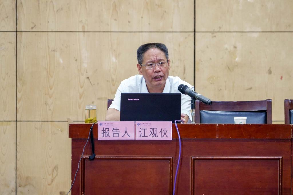 会上,江观伙教授首先对近期在全党开展的“不忘初心、牢记使命”主题教育目标要求、重要任务等进行解读,着重从新时代、新思想、新担当三个方面对习近平新时代中国特色社会主义思想作了系统详细的阐释辅导。报告既有理论高度,又有情感温度,并切合学校实际,其生动的案例、精辟独到的解读深深吸引在场人员。江教授的报告对与会的教职工准确把握习近平新时代中国特色社会主义思想理论体系、丰富内涵、精髓要义、重要意义,以及在学懂弄通的基础上牢记教育者初心使命、努力担当作为上有着重要指导意义。