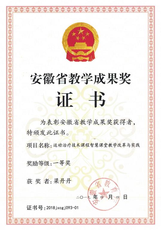 梁丹丹老师在教学工作上具有极强的事业心和责任感,认真负责完成各项教学任务。担任主讲康复专业核心课程《运动治疗学》《运动学基础》及课程设计,年平均授课量600课时左右,远超岗位课时需求。对学生严格要求,注重教书育人。在教学方法和教学手段上勇于创新,积极运用信息化手段授课,并将理论联系实践,受到学生和考核老师的一致好评。2018年获安徽省高职院校教学能力大赛一等奖,全国职业院校教学能力大赛一等奖,教学效果优秀。2019年在已有信息化教学改革及国家大赛获奖的基础上成功申报安徽省教学成果一等奖。
