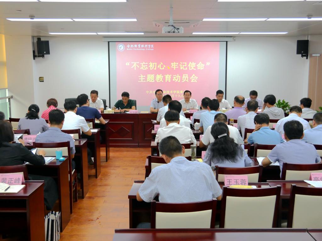 9月19日下午,学校党委在合肥汇心湖校区图书馆五楼会议室召开“不忘初心、牢记使命”主题教育动员会,就学校开展主题教育作动员部署。市委“不忘初心、牢记使命”主题教育第五巡回指导组组长、市委老干部局副局长夏士新一行四人莅临指导。参加会议的有学校领导班子成员,直属分党委书记,职能部门、二级学院党政负责人(含主持工作)及其他副处级干部。会议由党委副书记胡其云同志主持。