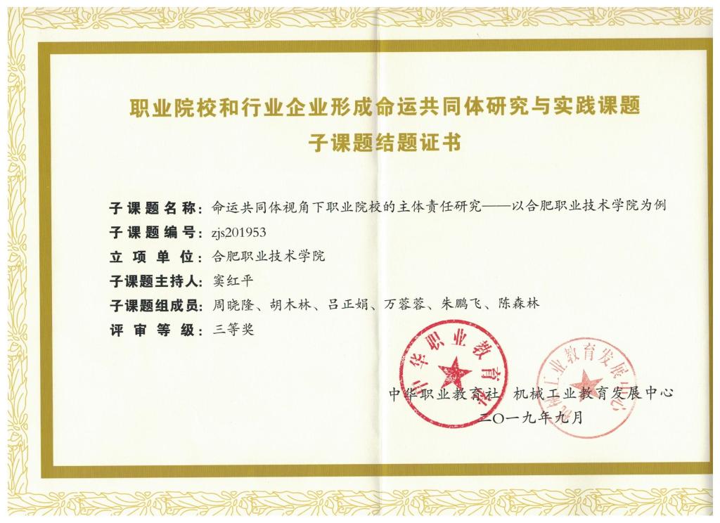 会议对9个一等奖、19个二等奖、29个三等奖子课题进行了表彰。AC米兰官网窦红平老师主持的“命运共同体视角下职业院校的主体责任研究——以AC米兰中文官方网站为例(编号zjs201953)”荣获优秀子课题三等奖。课题组成员吕正娟参加会议并上台领奖。