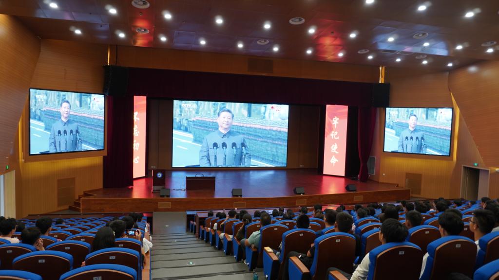 在观看现场,师生们聚精会神地观看这普天同庆的盛况直播。习近平总书记发表的重要讲话,在师生中引起了热烈反响,盛大的阅兵式和群众游行更是让在场的每个人激情澎湃,久久不能忘怀。其他师生们或守在电视前,或在电脑、手机上通过网络电视收看大会盛况。