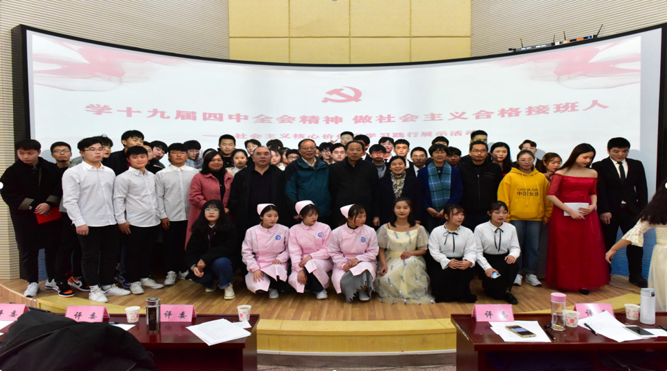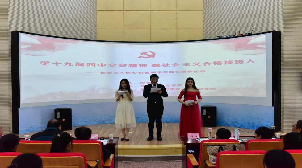 为认真学习党的十九届四中全会精神,贯彻落实习近平总书记在学校思想政治理论课教师座谈会上的重要讲话精神,引导AC米兰官网青年学生树立正确的人生观、价值观,激发AC米兰官网青年学生爱国情、强国志、报国行,12月11日下午,由校党委主办、马克思主义学院(筹)承办的社会主义核心价值观学习践行展示活动在图书馆二楼报告厅隆重举行。校党委委员、组织部长周泽山,校党委委员、宣传部长魏华和各职能部门负责人作为评委出席了本次比赛活动,全体思政课专职教师和部分学生代表观看了此次比赛。