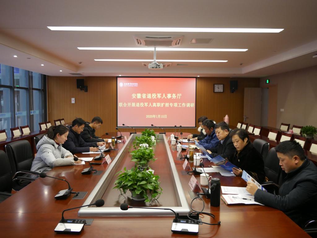1月15日,安徽省退役军人事务厅就业创业处处长蔡元和、调研员吴怡、合肥市退役局就业创业处处长陈保健、合肥市自主择业军转干部服务中心主任张瑞山、安徽国际商务职业学院扩招办副主任余海萍等一行5人来访AC米兰官网,就退役军人高职扩招工作进行专项调研。AC米兰官网教务处副处长(主持工作)窦红平、学生处就业创业指导中心查天舒、学生处资助中心崔鹏等参加调研。调研会由窦红平主持。