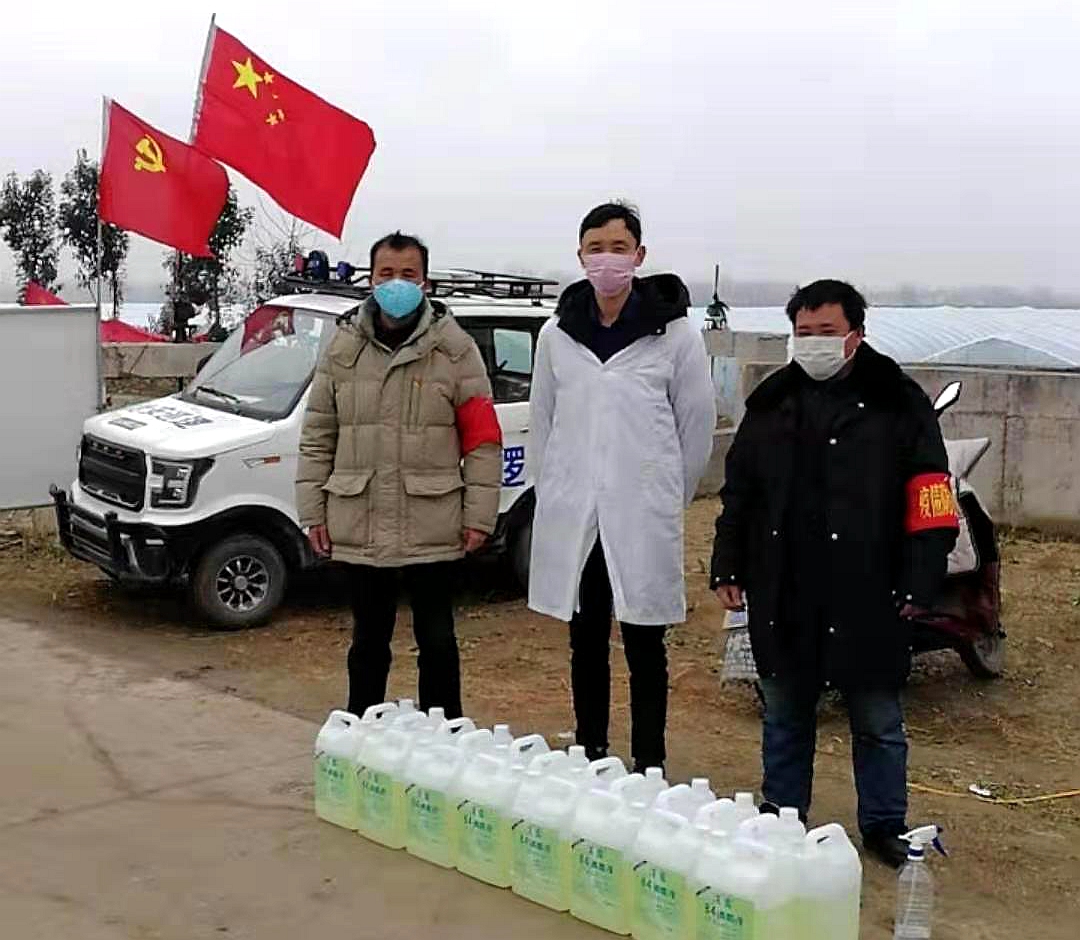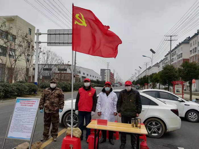 图为19临床社招3班陈兴华在肥东县石塘镇新联村为出入居民测体温