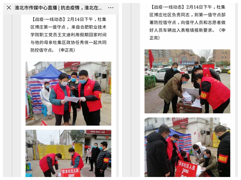 响应组织号召,主动参与社区志愿服务。疫情就是命令,防控就是责任,作为一名党员,王文迪老师时刻不忘党员在任何时刻都要起到先锋模范带头作用。疫情防控期间,在做好学校本职工作的同时,他主动到地方社区报到,服从组织安排,轮流到杜集高岳街道博庄社区检疫设卡处值班,和母亲一起共同防控值守点,做好外来人员的登记、测量体温、消毒等工作。工作事迹在淮北市传媒中心直播“抗击疫情,淮北在行动”和“杜集先锋”发布。