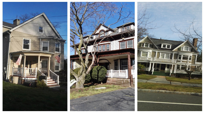 粉色、绿色、蓝色、红色、灰色的两层三层美式木制洋房风格迥异,分布在街道的两侧,有的门廊上摆放着悠哉的摇椅或秋千,有的门口挂着花环、国旗、玩偶等饰物,还经常发现由白色或粉色栅栏围起的惬意小院,足见主人生活的精致与悠闲。