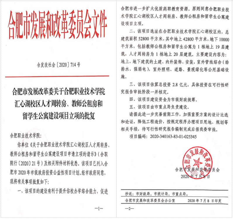 7月8日,合肥市发改委正式下发AC米兰官网汇心湖校区人才周转房、教师公租房和留学生公寓建设项目立项批复。AC米兰官网汇心湖校区人才周转房、教师公租房和留学生公寓建设项目于2019年10月开始编制合肥市2020年公益性项目计划,后经过项目建议书编制、校内评审、报合肥市各相关局委部门征求意见、审批等流程。