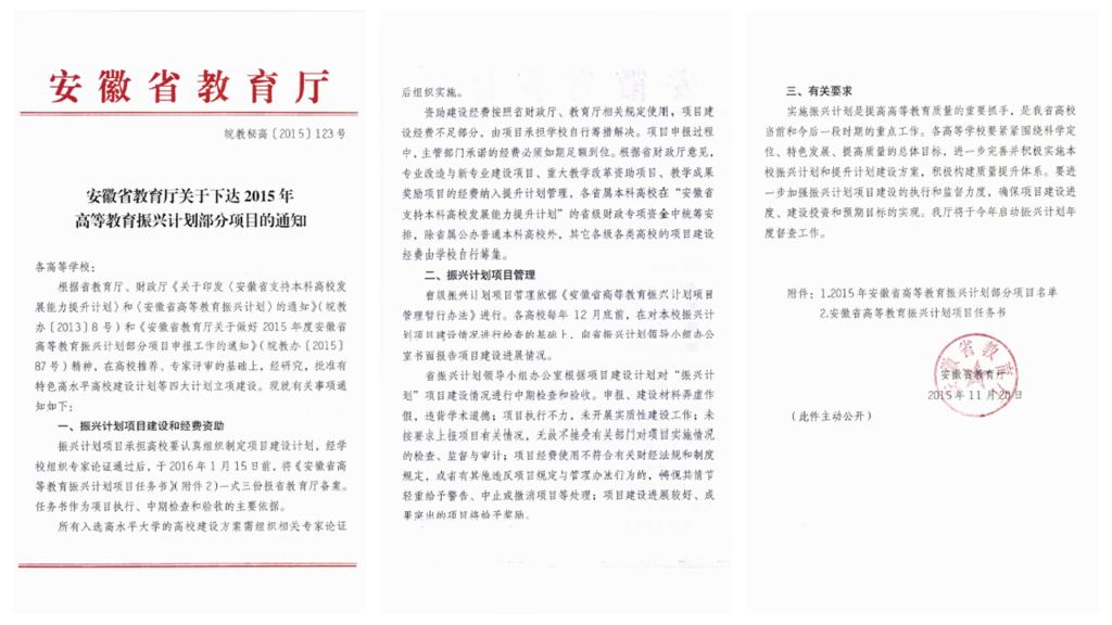 立项分类建设地方高水平大学是我省为深入贯彻国家和省《中长期教育改革和发展规划纲要》精神,全面落实《安徽省高等教育振兴计划》,引领我省地方高校分类发展,科学构建地方应用性高等教育体系所做出的一项重要举措。根据《安徽省教育厅关于地方高水平大学立项建设分类发展的意见》(皖教高〔2014〕17号),地方高水平大学分类建设为地方特色高水平大学、地方应用型高水平大学和地方技能型高水平大学三类。省教育厅通过组织专家评审、现场答辩等形式,进行了严格的遴选,最终确立了安徽省地方高水平大学首批立项建设单位,其中地方特色高水平大学8所,地方应用型高水平大学9所,地方技能型高水平大学16所。