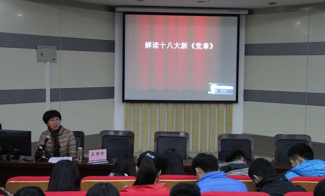 开班典礼结束后,经贸系党总支书记王秀珍为学员上了第一堂党课——《解读十八大新党章》。