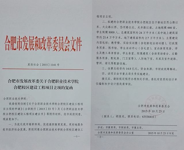 10月23日,学院新校区项目立项获得合肥市发改委同意并批复。该项工作对学院建设新校区具有里程碑意义,标志着合肥新校区建设工作进入了实质性阶段。
