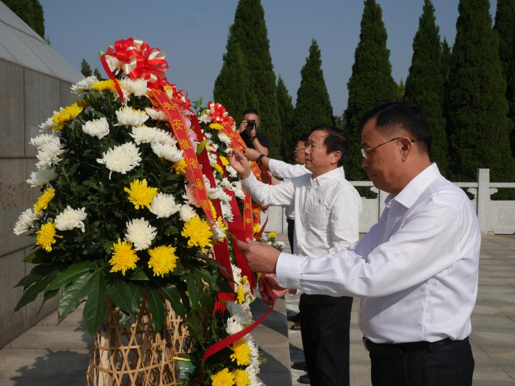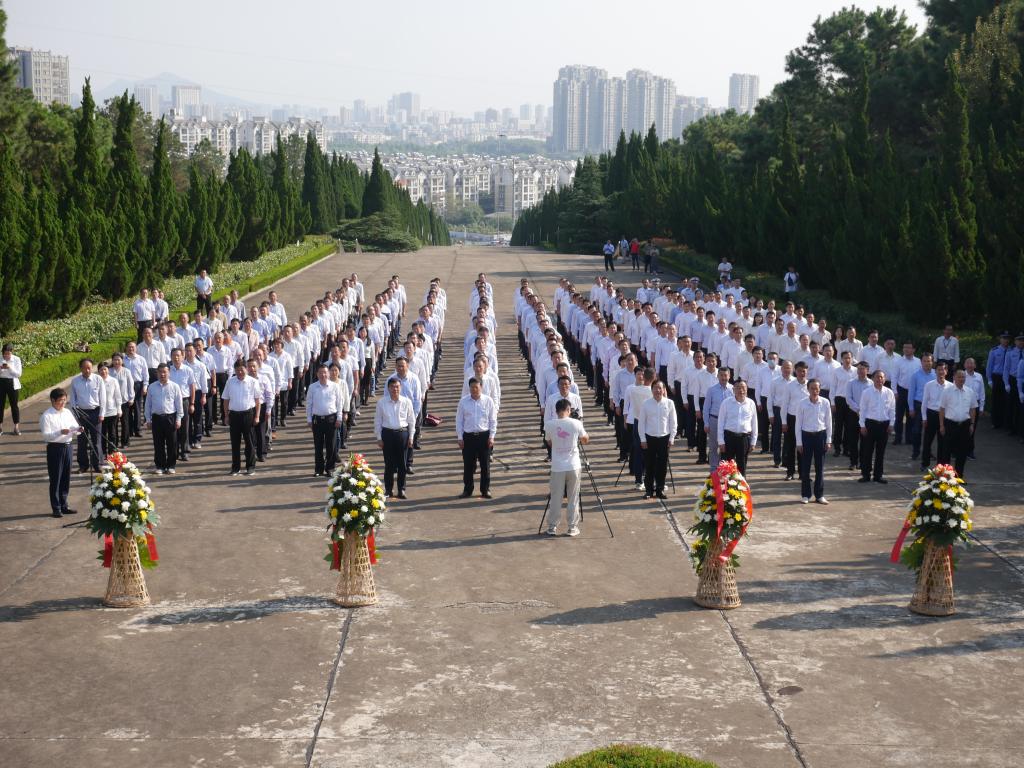 耿延强、罗兆好、程习龙、吕虎在花篮前驻足凝视,仔细整理花篮缎带,缅怀先烈,全体人员向烈士行三鞠躬礼。最后,参加活动全体人员依次走到纪念碑前,献上手中鲜花并瞻仰纪念碑,表达对英烈们的无限敬仰和怀念之情。
