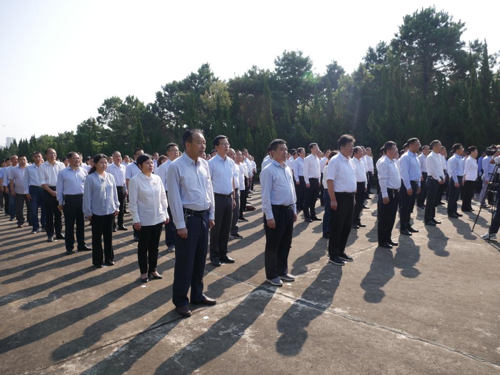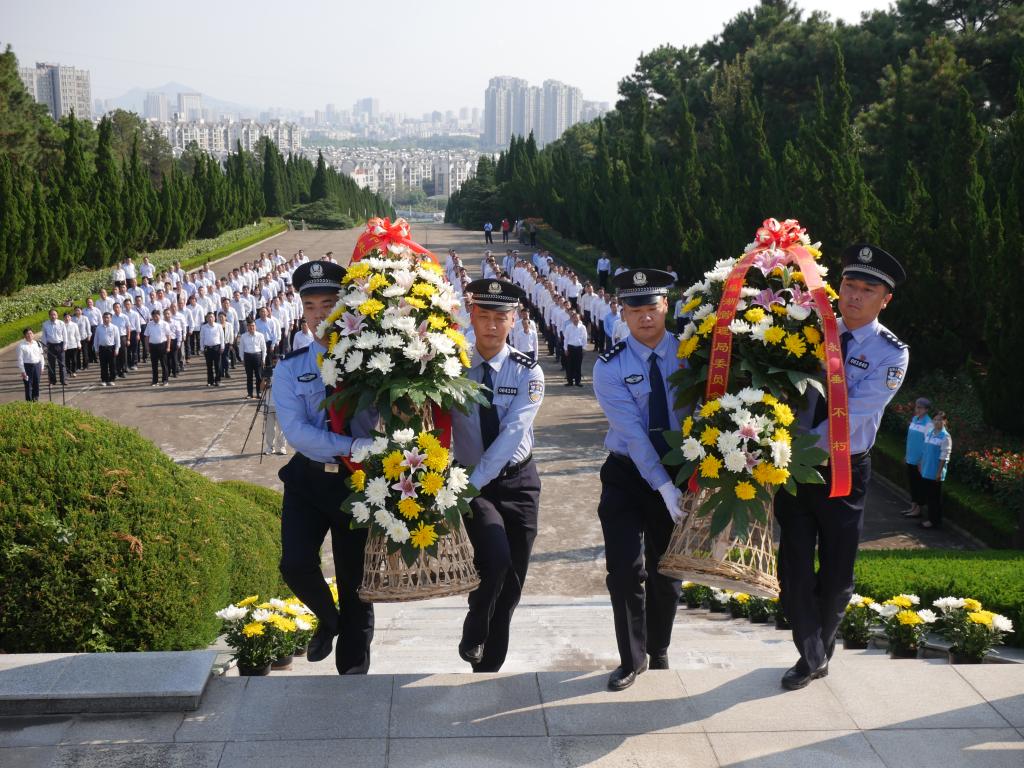 初秋的南山烈士陵园苍松翠柏,烈士纪念碑巍然耸立,花岗岩浮雕上镌刻着“革命烈士永垂不朽”8个大字,令人肃然起敬。上午9时,活动正式开始。在庄严肃穆的气氛中,全场肃立面向庄严的革命烈士纪念碑高唱《中华人民共和国国歌》。国歌唱毕,全场脱帽肃立,向烈士默哀一分钟,寄托哀思之情。随后,8名礼仪士兵手抬花篮缓步前进,将花篮排列放在纪念碑基座前。