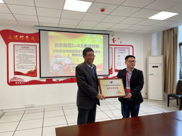 最后,孙兴林、袁雄代表校企双方为“1+X”大数据财务分析师资培训基地揭牌。