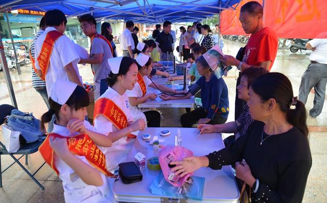 此次志愿活动分为量血压、测血糖、健康咨询、电子商务与网上购物咨询四个小组。由医务所、医学分院、计算机系党员教师和学生入党积极分子组成。尽管天公不作美,但是大批居民前来咨询就诊,现场气氛十分热烈。活动现场,我院师生在为居民义诊的过程中,耐心讲解日常生活中的健康知识,以及高血压、高血脂、糖尿病等常见病的预防和治疗,并提醒他们平时要“迈开腿,管住嘴”,适当活动,健康饮食,并赠送了居家常用药品。正值高考填报志愿之际,很多市民在就诊的同时,认真阅读我院《2015年招生指南》,并向师生了解我院招生专业情况。