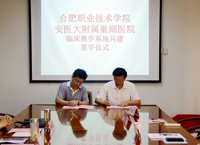 继5月23日我院与安徽医科大学巢湖临床医学院召开医学影像技术专业合作办学研讨会后,6月19日,我院与安徽医科大学巢湖临床医学院共建临床教学基地签字仪式在安徽医科大学巢湖临床医学院三楼会议室举行。会上分别就临床教学基地建设、技能培训中心建设、师资队伍培养机制、教学能力培养等方面加强合作事宜进行了深度协商与探讨。院长方志斌与安徽医科大学巢湖临床医学院院长李家斌代表各自单位在协议书上签字,并进行了医学影像技术教研室成立揭牌仪式。