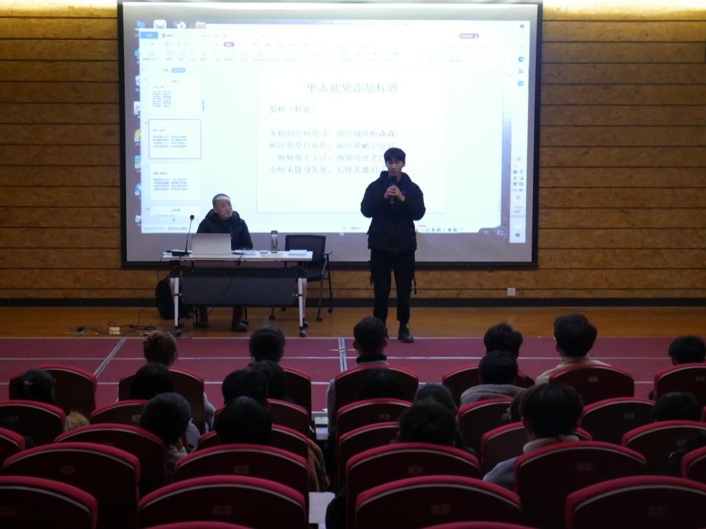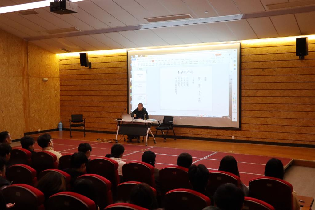 孙启放老师在讲座中讲述了中国诗歌的发展史,通过分析六个时期的诗歌,剖析了诗歌的内在,阐述了诗歌存在的重要意义。他结合《关雎》《蒹葭》《蜀相》等作品指出诗歌中蕴藏着历史、哲学、文化,明确并肯定了诗歌基础对提高青年学子们文学水平和人文素养的重要性。讲座过程中,孙启放老师采用提问、背诵诗歌的方法与同学们互动,并赠送给部分回答优秀的同学们自己创作的诗集。