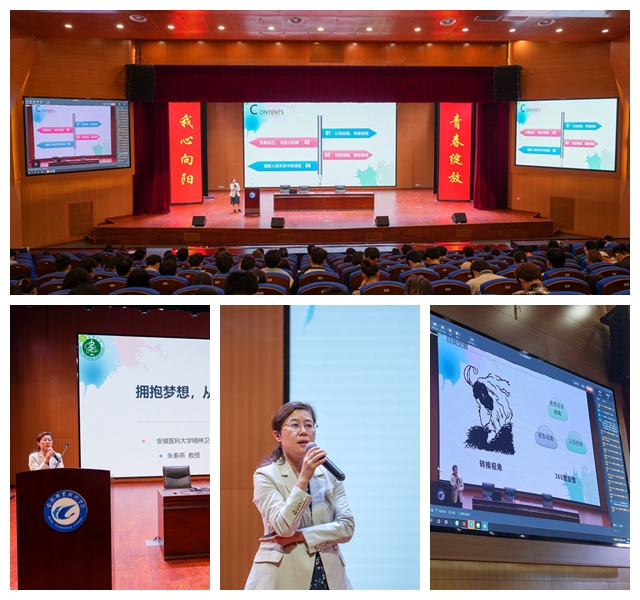 启动仪式之后,安徽医科大学精神卫生与心理科学学院副院长朱春燕教授为全校师生做了题为《拥抱梦想,从“心”开始》的专题讲座。朱教授主要从认知自我,突破自我;关爱自己,和压力和解;识别情绪,接纳情绪以及理解人际关系中的误区四个方面,结合工作中的个案分析,引导大学生有效情绪管理和积极压力应对。她渊博的专业知识和富有激情的语言,博得了师生们的阵阵掌声。