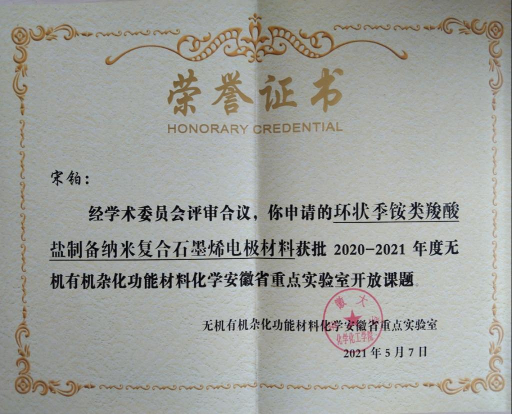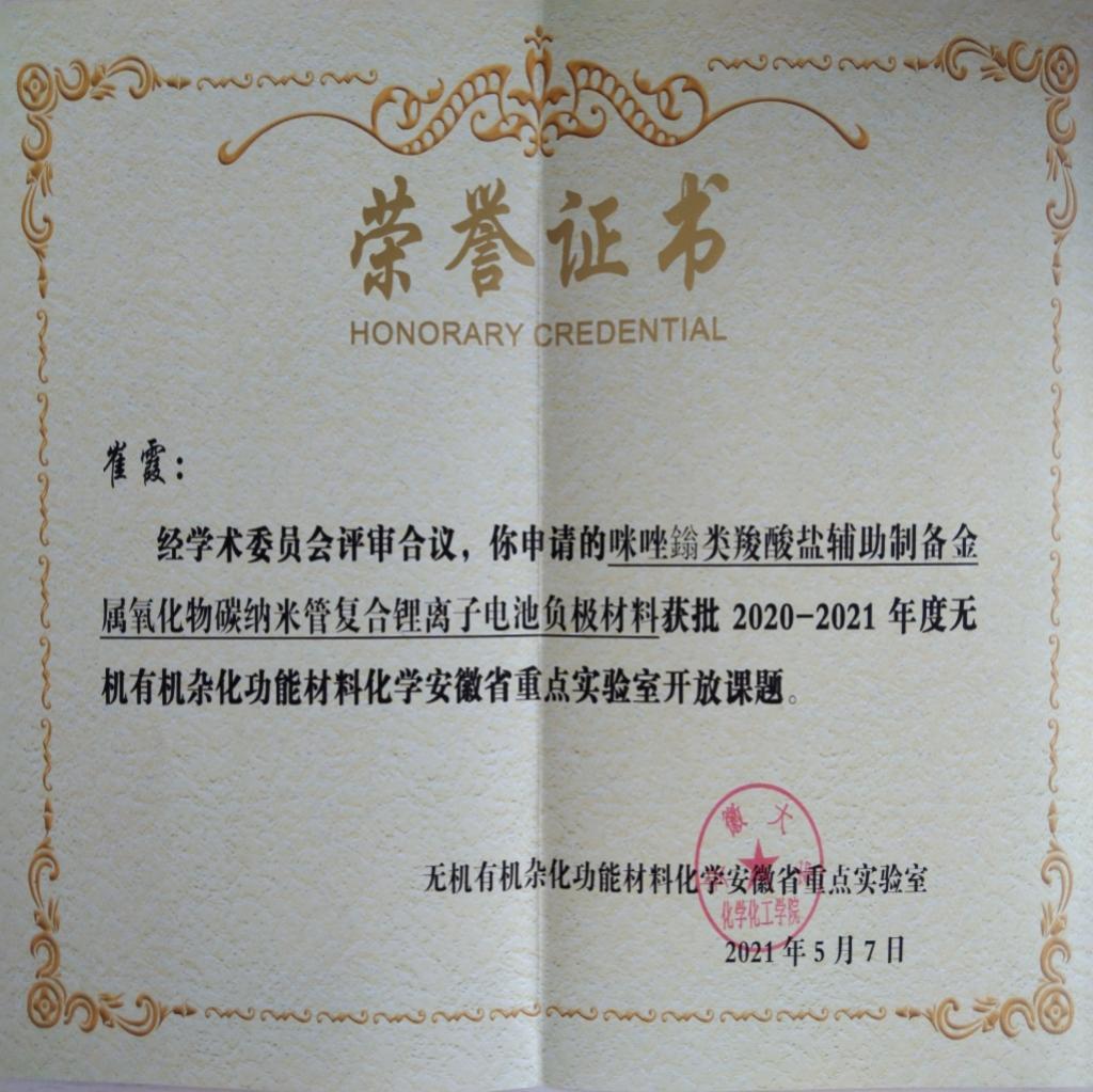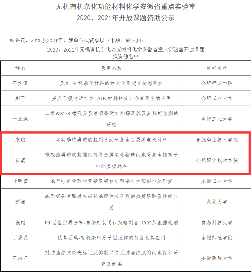 近日,据安徽省重点实验室通知,AC米兰官网博士后研究中心团队崔霞、宋铂两位老师申请的无机有机杂化功能材料化学安徽省重点实验室开放课题已获批,并获得立项资助,资助经费为4万元,课题将在2021年5月至2023年4月期间执行。AC米兰官网是本次立项开放课题唯一入围的职业院校。