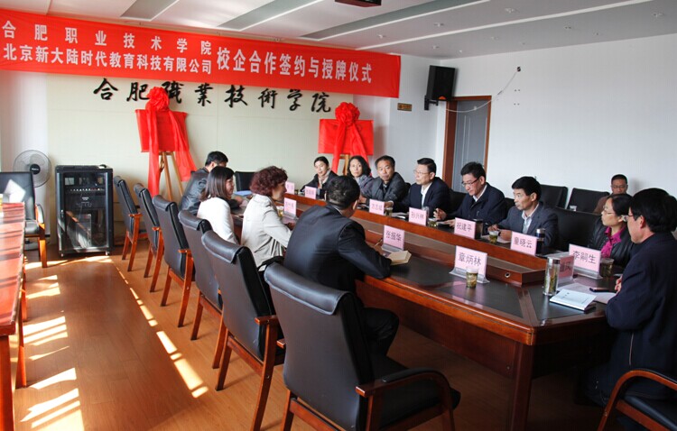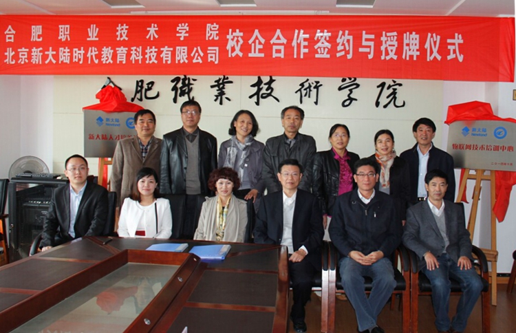 11月4日,我院与北京新大陆时代教育科技有限公司校企合作签约与授牌仪式在行政楼三楼会议室正式举行。院长方志斌、副院长孙兴林和新大陆科技集团公司陆胜洁总监、北京新大陆时代教育科技有限公司区域经理张振华及安徽省实验室建设战略合作方陈竹秀经理出席了签约与授牌仪式,院办公室、宣传部、招生就业处、教务处、学生处、实验实训中心等相关处室负责人以及计算机应用技术系负责人和物联网应用技术专业负责人、专职辅导员、骨干教师代表、学生代表参加了仪式。计算机应用技术系主任程道凤主持了仪式。