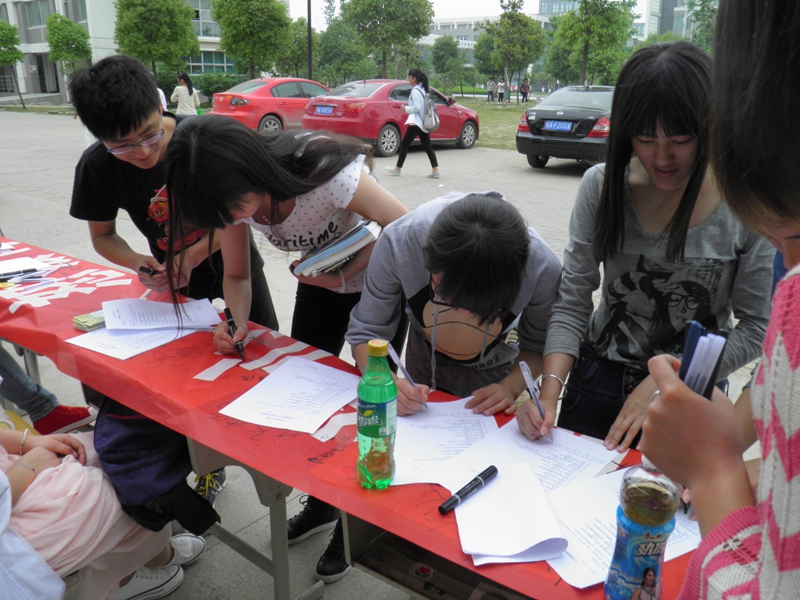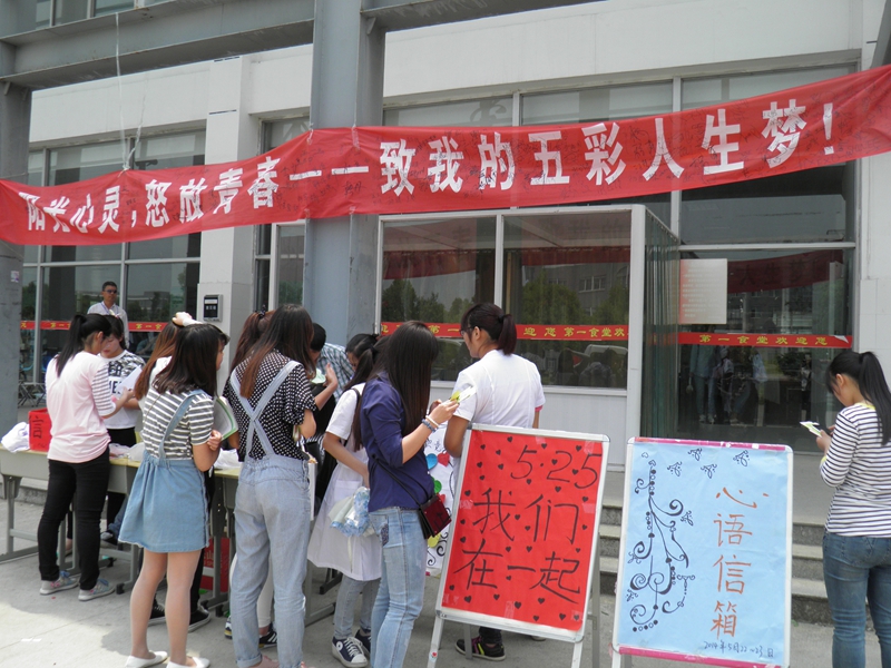 宣传周活动启动仪式“阳光心灵,怒放青春——致我的五彩人生梦”心理健康大型签名活动,5月19日中午在学院第一食堂门口举行。签名会现场热闹非凡,同学们纷纷拿起笔在条幅上郑重地签下自己的名字,表达对青春的热爱、对梦想的追求。“心理健康关注你我他”知识竞答活动通过有奖答题的方式向学生们宣传心理健康知识,在学生中掀起了学习心理知识的热潮。“爱的抱抱”温暖校园行动、“心心相融”心语传话筒等活动同样受到同学们的欢迎。同学们纷纷在“感恩”板和“祝福”板上留下祝福与希冀,表达了对梦想的憧憬,感受到了暖暖的情谊。同学们将自己精心准备的一封封信,通过我们的心语信箱传送给对方,这是心与心的传递,心与心的沟通。
