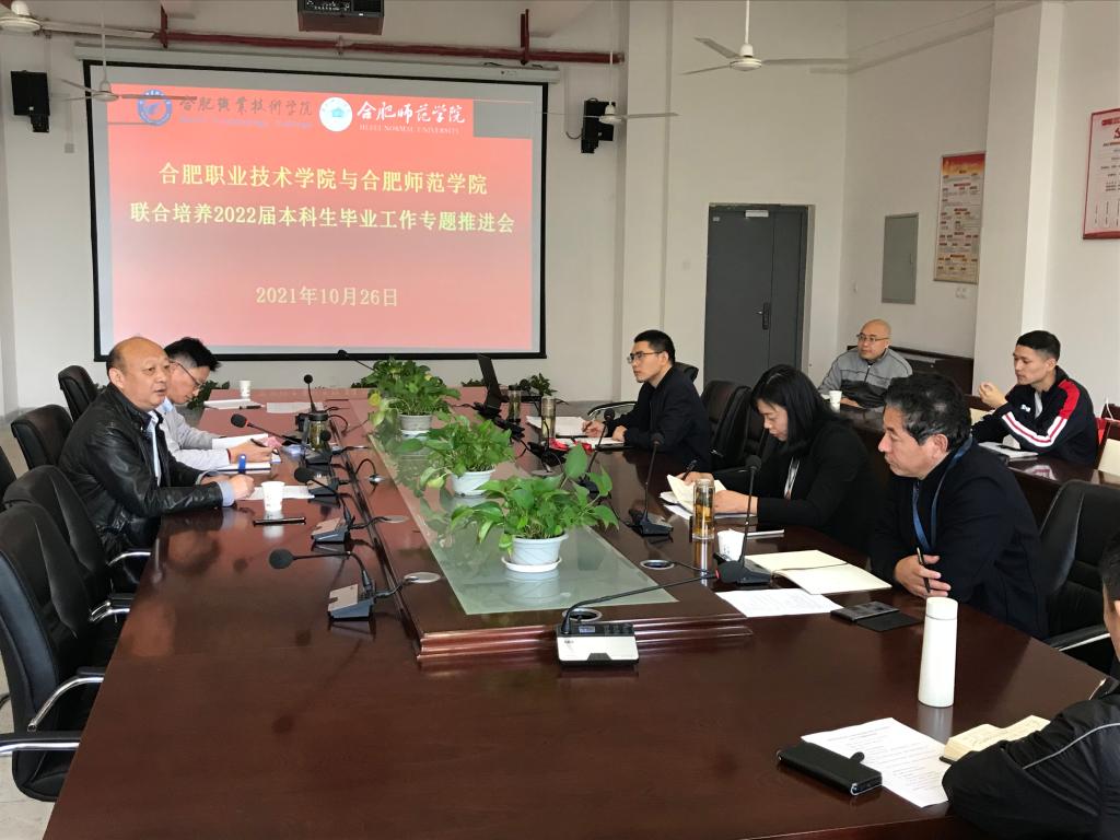 会上各二级学院主要负责人针对各相关专业本科毕业工作情况进行了汇报,各学院在先期工作中已分别与合肥师范学院相关部门进行了协调和沟通,体质健康测试工作正有条不紊的进行中,毕业论文指导教师遴选、学生分组工作正陆续展开,下一阶段将在两校相关部门共同指导下进行部署。