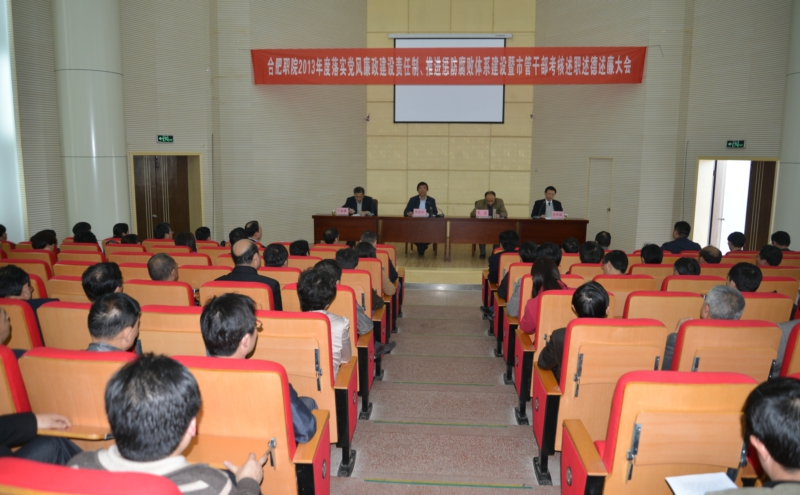 学院党委书记丁家康同志主持会议,李武好同志代表合肥市委作动员讲话,就此次考核的对象、考核的内容、考核的方法和步骤等工作作具体部署,并提出了几点要求。院党委副书记、院长方志斌同志代表院领导班子作工作总结。会议的最后,在参会的全院副高级以上职称教师,副科级以上干部中进行了民主测评和民主评议。