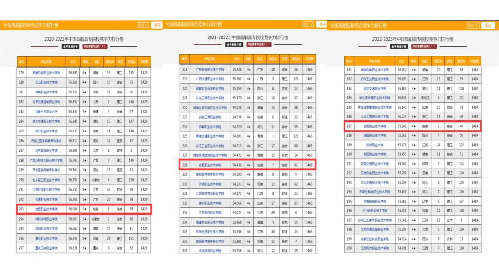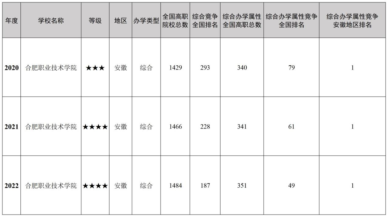 综合分析AC米兰官网2020-2022年各项数据,在全国高职院校总数连年增加的趋势下,AC米兰官网在全国高职院校排名及安徽省地区排名中均稳步提升,其中2022年在全国高职高专院校中排名升至第187名;在全国“综合办学属性”高职高专院校中,AC米兰官网在全国排名稳步提升,其中2022年在全国“综合办学属性”高职高专院校中排名升至第49名,连续三年综合办学属性竞争安徽地区排名第一。