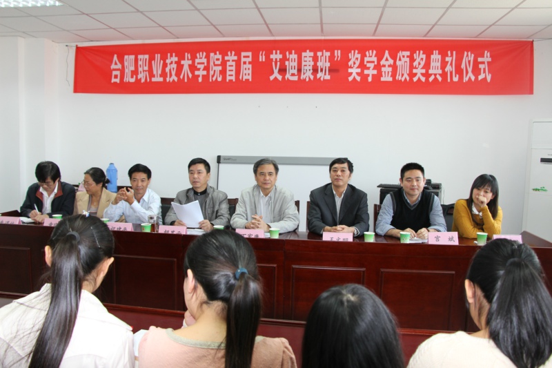 随后,王文明总经理发表了激情洋溢的讲话,艾迪康公司人力资部经理宫斌宣读了10名获奖学生名单,院领导和艾迪康公司领导给获奖同学进行了颁奖以及奖学金的现场发放,并合影留念。