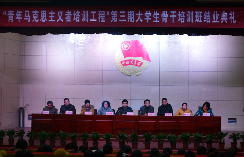 1月5日下午,由院团委主办的 “青年马克思主义者培养工程” 第三期大学生骨干培训班结业典礼在大学生活动中心隆重举行。院党委副书记胡其云、宣传统战部、学生处、招生就业处等有关部门负责人及各系党总支书记参加了培训班结业典礼。