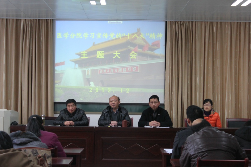 为统一思想,凝聚力量,深入学习宣传贯彻党的十八大”精神,进一步推动医学分院各项工作再上新台阶,12月5下午,医学分院党总支在医学楼北楼会议室召开全体教职工大会,会议由医学分院院长周晓隆主持。