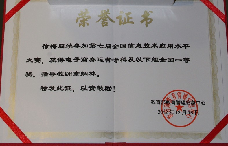 这是我院第二次参加全国信息技术应用水平大赛,相比去年的第一次,从预赛复赛以至进入决赛的人数到各奖项的取得,都获得了长足的进步,尤其是今年的电子商务运营项目,获得了全国一等奖,是一个突破。