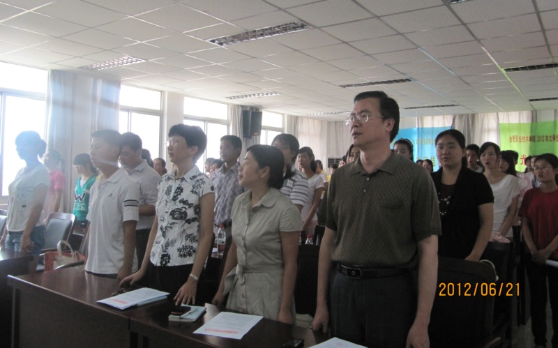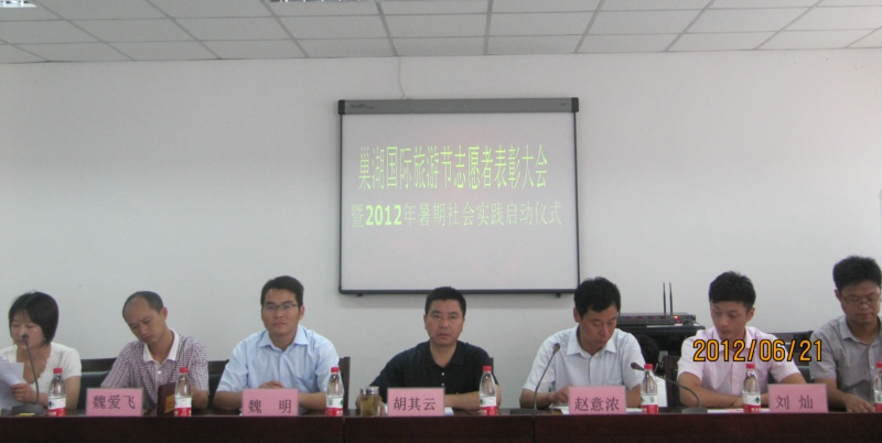 6月21日上午,巢湖国际旅游节志愿者表彰大会暨2012年暑期社会实践活动启动仪式在行政楼五楼会议室举行。院党委副书记胡其云、巢湖团市委副书记魏明、巢湖旅游局副局长赵意浓以及各系(分院)党总支书记、团总支书记出席本了本次活动。活动由院团委副书记佘海月主持。