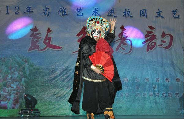 在阵阵掌声中,滁州学院花鼓艺术团的演员们火爆亮相,带来了激情四射的开场舞《火火的花鼓敲起来》,敲出了喜悦,敲出了幸福。演员们甜美的笑容,优雅的身姿,变幻的舞步以及手中灵活的花鼓得到了观众的认可。翩翩的身影还未在脑海消散,脍炙人口的《花鼓凤阳》便在舞台中央响起,说凤阳,道凤阳,凤阳是个好地方,嘹亮的歌声将我们的心引向那片古老、熟悉的土地。正感叹着凤阳如今的变化,青春的旋律已蓬勃响起,舞蹈《青春纪念册》让观众感受到处在这样充满激情的青春时刻,应该一起享受青春的美好、快乐。青春的感叹在清脆的竹笛声中戛然而止,滁州学院青年教师秦峰的笛子独奏《帕米尔的春天》带来的是气势,是震撼,还有精彩,婉转的笛声如同攀爬起伏跌宕的群山。灯光交错,舞台上的气氛突然凝重起来,音乐剧《忠魂》开始了,场景不断切换着,沈浩同志为党、为人民无私奉献的短暂一生在舞台上重生了!“站起来,你是一座雕像;倒下去,你是一座丰碑。”舞姿明艳动人、风度翩翩,歌声亦高亢浑厚、富有磁性,男生小合唱《凤阳花鼓》展现了新时期小岗人民对家乡的热爱;川剧《变脸》一出场便使得全场沸腾!演员走下台近距离展现给观众古老的变脸技艺,观众们睁大好奇的双眼,不断的惊呼那变幻的脸庞,演员退场后仍觉意犹未尽。伴随着高亢激昂的男女声二重唱《阳光路上》,“鼓乡情韵”主题文艺专场演出活动圆满落幕。