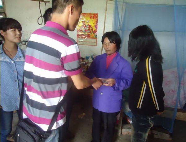 我院学生代表亲手将爱心款交到陈月霞母亲手上