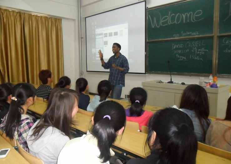 David语言风趣幽默,诙谐生动,为同学们介绍了牙买加的学习环境与生活习惯,引起了学生们的极大兴趣。David还模仿了电视广告里的英语片段,场下掌声不断,学生反响热烈。同学们还就关心的问题和David用英语进行交流。David不仅认真回答了同学的问题,还对他们的的英语表达能力给予充分的肯定,并进行现场指导。