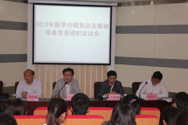 2012年4月19日下午,医学分院党总支在学院图书馆一楼报告厅举行吸收预备党员组织谈话会。学院党委书记丁家康出席并作重要谈话,强调大学生党员要树立远大理想,勇作表率。