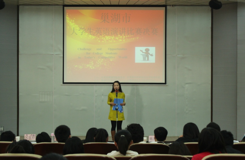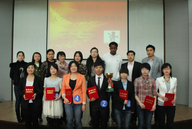 为加强我院和巢湖学院的交流与合作,为广大英语爱好者提供展示风采的舞台,由两校团委牵头,英语协会组织举办的巢湖市大学生英语演讲比赛决赛于4月15日下午在巢湖学院物理报告厅成功举办。我院团委佘海月副书记、陈敏艳老师,巢湖学院团委刘金平书记等观看了整场比赛。我院3名英语老师慈龙保、唐瑞娟、刘靓及巢湖学院2位英语老师和外教担任了比赛的评委。