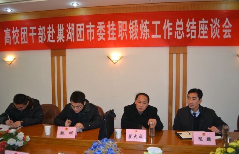 我院选派团干部王文飞同志从工作开展情况、体会与收获、存在的不足及今后的打算等几个方面就挂职一年来的情况作了详细的汇报。巢湖团市委也对挂职干部作了总体评价。医学分院周院长和院团委佘书记在会上分别发言,感谢巢湖团市委对我院团干部的培养,锻炼了能力,拓展了视野,希望今后加强联系。