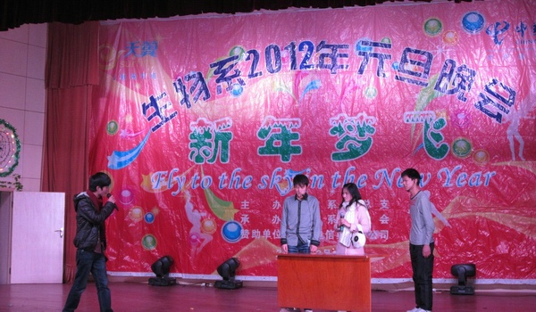 12月19日晚,生物系2012年元旦晚会在大学生活动中心举行。院长方志斌、院纪委书记金辉出席了此次晚会,招生就业处和生物系负责人以及生物系全体师生观看了这场晚会,共庆元旦佳节。