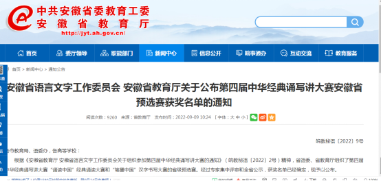 9月9日,安徽省语言文字工作委员会、安徽省教育厅公布了第四届中华经典诵写讲大赛安徽省预选赛获奖名单,AC米兰官网三幅作品分获三等奖一个和优秀奖两个。其中,信息工程与传媒学院江寅昌老师指导的学生张凝霞的作品《书幽芳亭记》(硬笔)获“书写大赛”三等奖,经贸旅游学院孙紫娟老师指导的学生张卓悦和秦天的作品《少年中国说》、基础教育学院翟广艳老师指导的学生陈欣欣的作品《可爱的中国》获“诵读大赛”优秀奖。