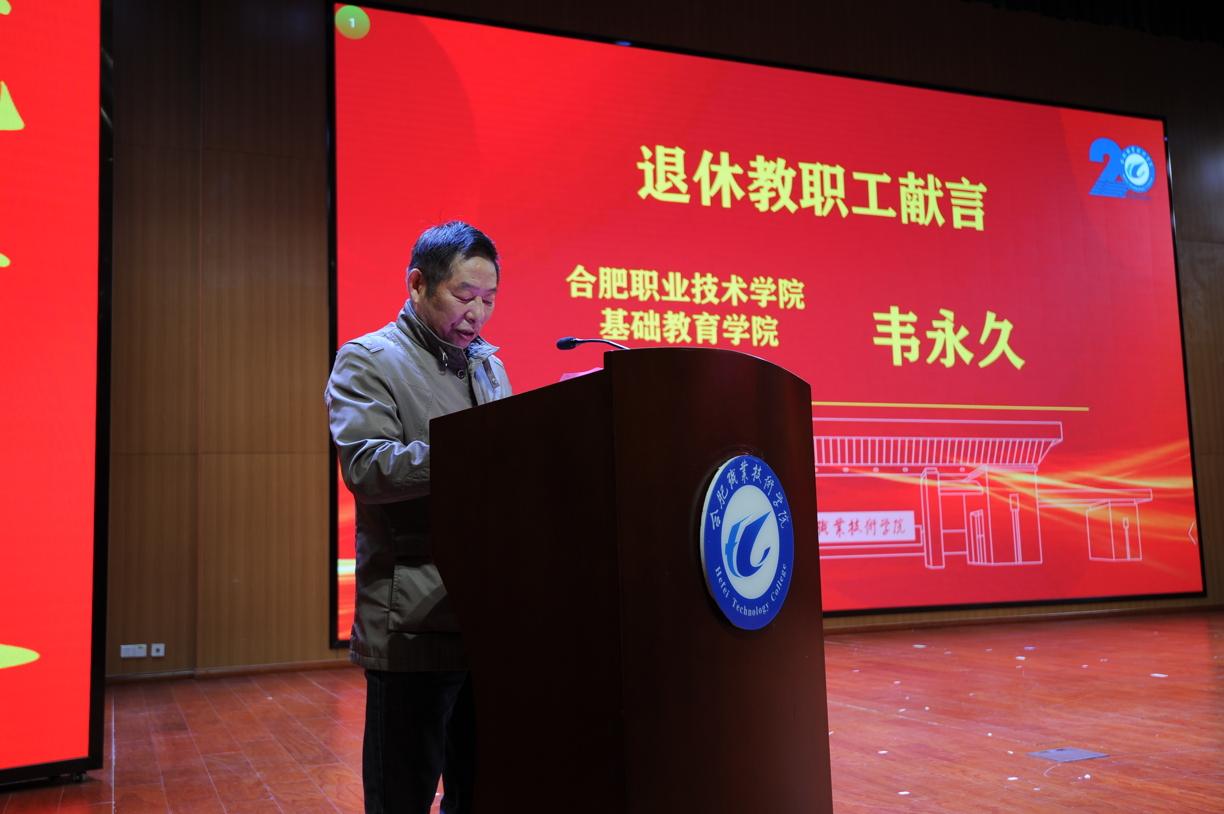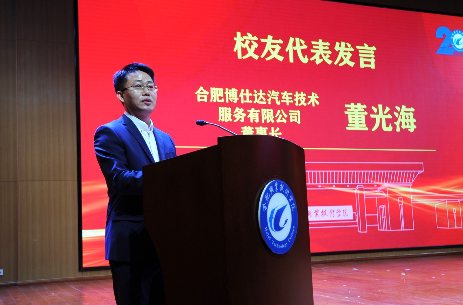 退休教职工代表韦永久,青年教师代表、机电工程学院院长胡木林,校友代表、合肥博仕达汽车技术服务有限公司董事长董光海依次发言,表达了对学校的深深热爱,抒发了对教师职业的挚爱和敬畏,回顾了自己与学校共成长的历程,表达了对学校美好的祝愿。新冠肺炎疫情使很多校友不能来到庆祝大会现场,但却阻隔不了他们对学校的真挚情感,他们纷纷向大会发来寄语视频,表达对母校的深情祝福!