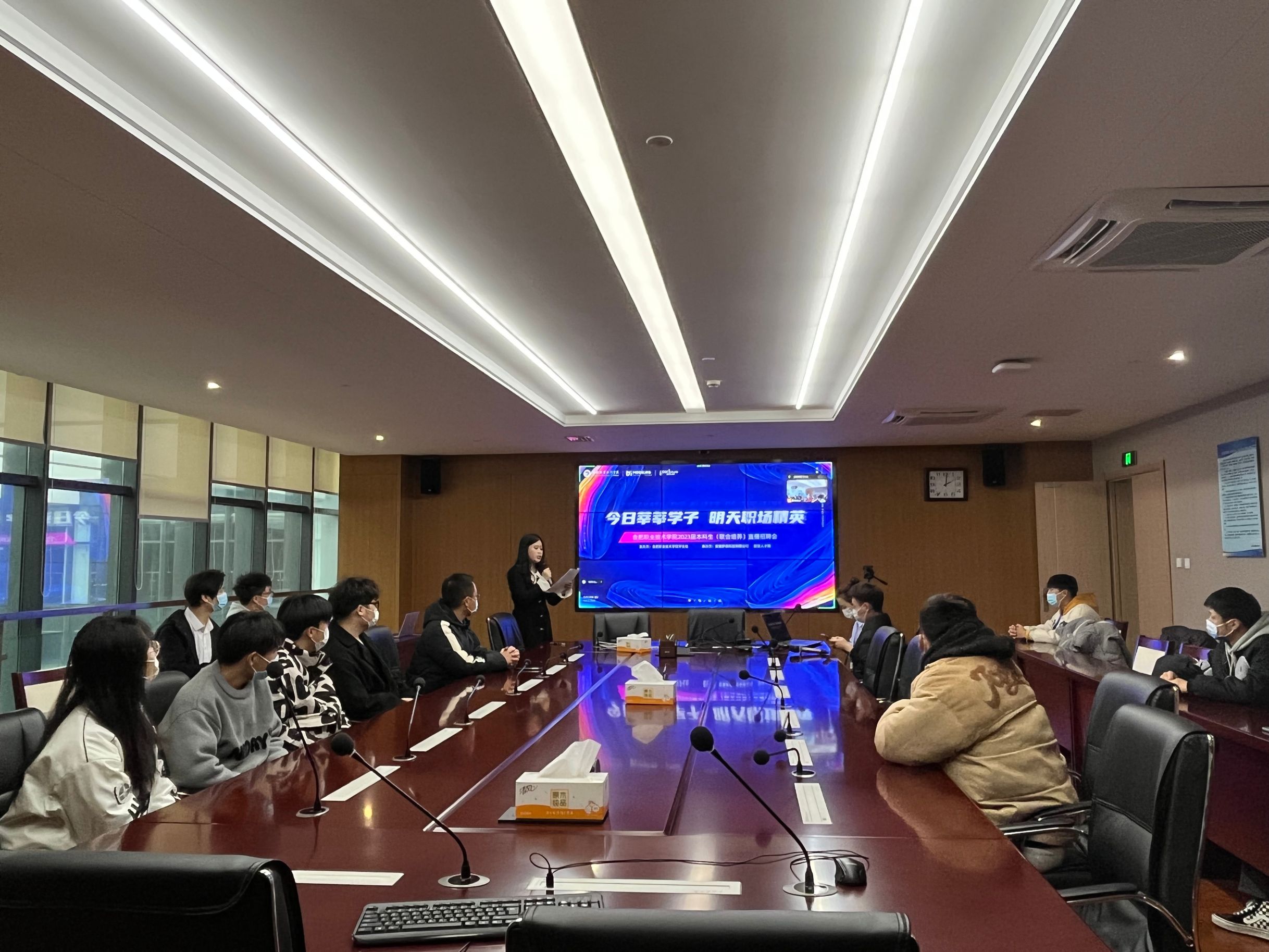 为搭建毕业生与用人单位的双向交流平台,促进人岗对接,推动毕业生更高质量更充分就业,学生处于12月7日下午与新安人才网、安徽梦森科技有限公司联合举办2023届本科生直播招聘活动,本次招聘活动采取线上线下相结合的形式开展。线下在汇心湖行政楼627会议室设立主会场,2023届本科毕业生代表线下参会;线上使用腾讯会议,企业方及其他毕业生线上参会。