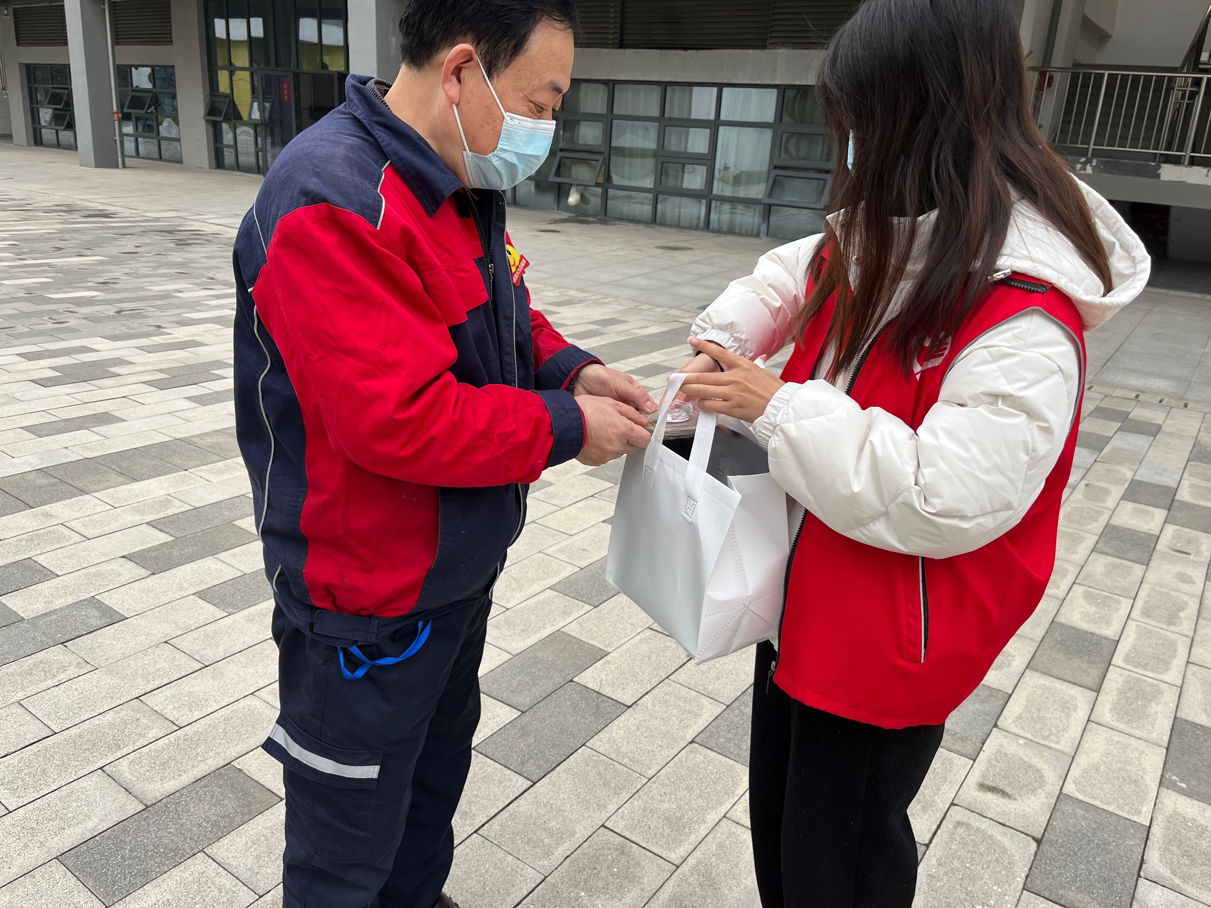 活动过程中,食堂内,每位工作人员都在忙碌准备着同学们的早餐。冬日的第一杯姜汤,送给了食堂的叔叔阿姨。教学楼内,老师们在准备着早上的第一节课。志愿者们蹑手蹑脚的端上姜汤,为老师们驱寒保暖。校园内,保洁阿姨手中的扫帚正一下一下地清扫着地面。志愿者们连忙上前接过她们手中的工具,细心地为阿姨们递上姜汤,戴上围脖。宿舍门前,宿管阿姨正在认真负责地坚守岗位。当看到志愿者到来时,他们接过姜汤,仔细地啜了一口,兴奋地戴上了围脖并且露出了灿烂的笑容。