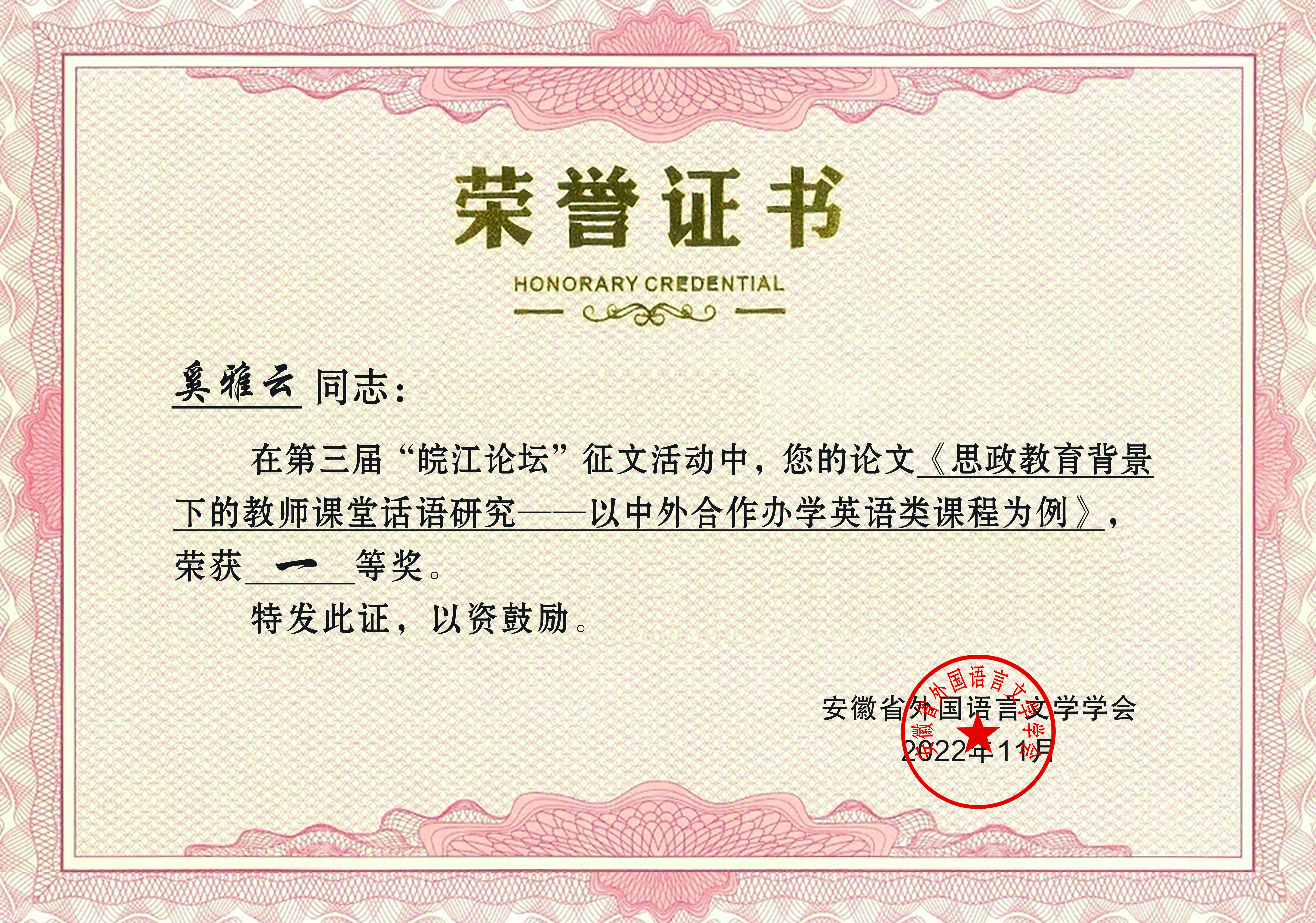 会后,安徽省外文学会秘书长曹军教授宣读了第三届皖江论坛征文获奖结果。本次论坛分翻译、语言学与跨文化、文学、高职、教学五个组别,共收到征文稿件157篇。这也是安徽省外文学会年会首设高职高专分论坛和论文单独评审。基础教育学院高度重视此次征文比赛,积极动员教师投稿。经专家匿名评审,奚雅云老师的《思政教育背景下的教师课堂话语研究——以中外合作办学英语类课程为例》和尹悦老师的《合作办学英语课程中沉浸式英语教学应用研究》两篇论文分获高职高专组一等奖和二等奖。