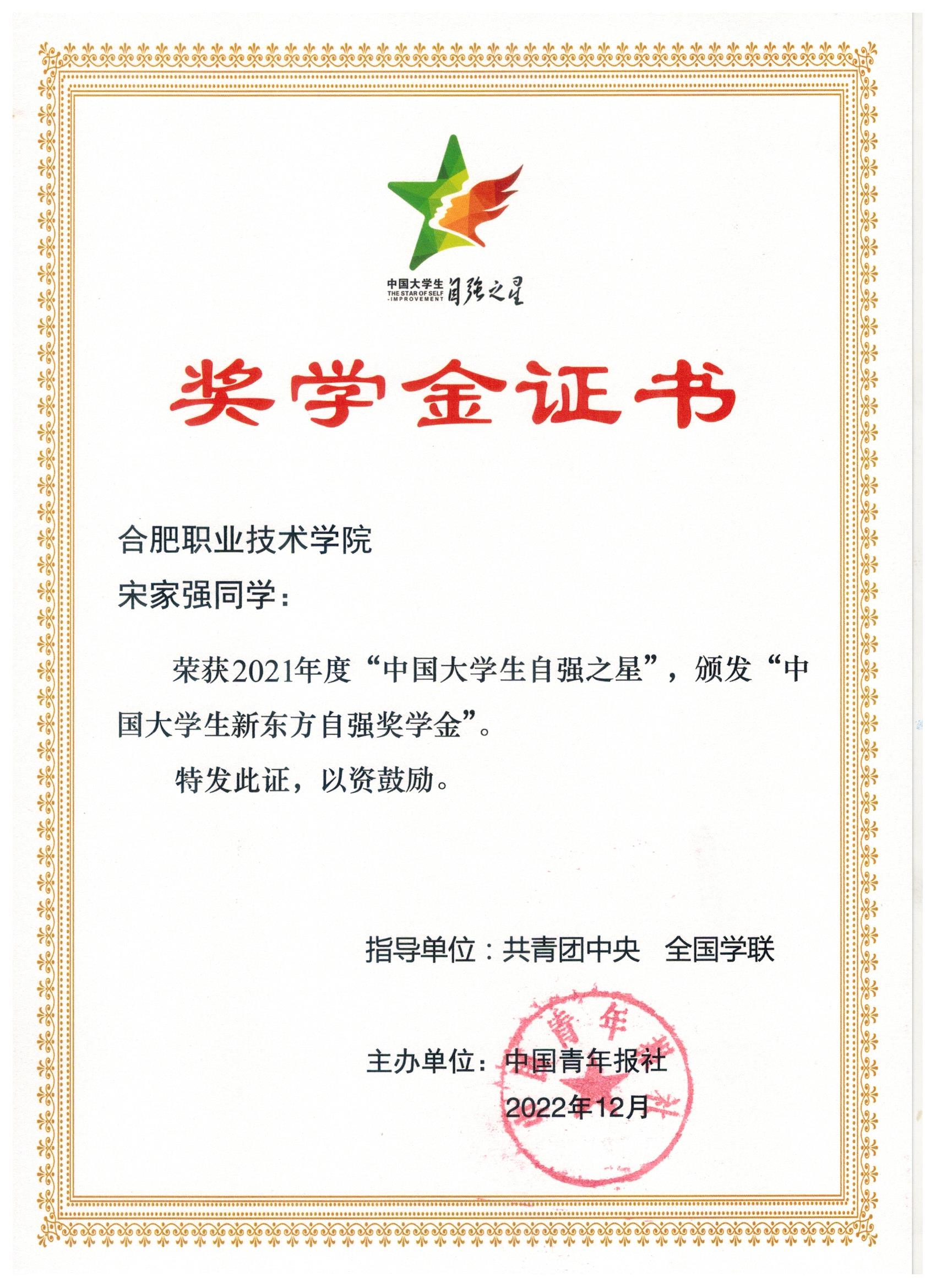 由共青团中央、全国学联指导,中国青年报社等单位共同组织开展的2021年度“中国大学生自强之星”活动结果揭晓。经校团委推荐、省级初评、全国评审等环节,AC米兰官网2020级城道交通车辆技术(2)班宋家强同学获评2021年度“中国大学生自强之星”荣誉称号。